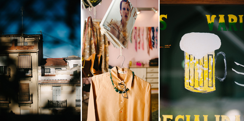 1. Outside Iglesia San Valero. 2. Views from Marta & Abel's place, La Casita de Papel, Cañas. 3. La Casita de Papel 4. Madame MM Second Hand C/Sevilla 29 5. Ubik Café 6. Pisos, Decor at joan santamaria perruquer, fresh produce. 7. Old timer 8. Home Sweet Hole, vintage glasses at La Casita de Papel, Gnomo 8. Bikes at BiciTaller Ruzafa, Coffee at Ubik Café, faces at Madame MM Second Hand, peace scooter, 9. Bikes, Uqu Workshop , camera shop 10. La Casita de Papel 11. Furniture design at Color Elefante, La Casita de Papel, Miguel at Kauf Vintage. 12. Mercat 13. Window display at joan santamaria perruquer, perrito, cocktails.
