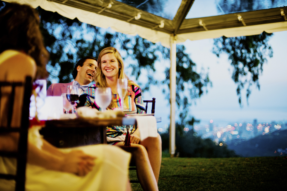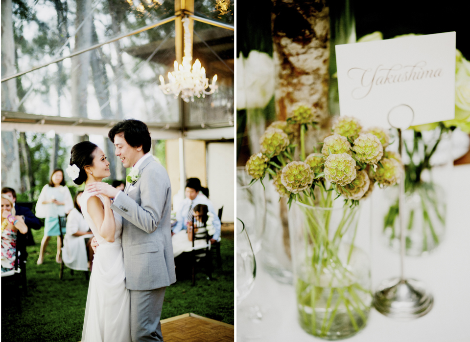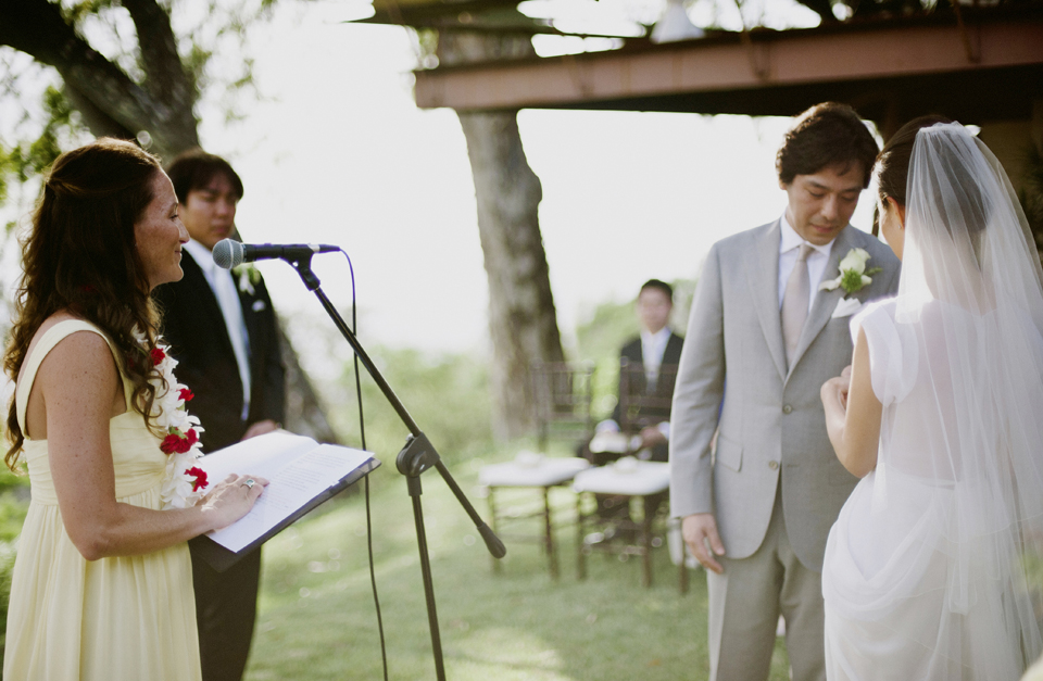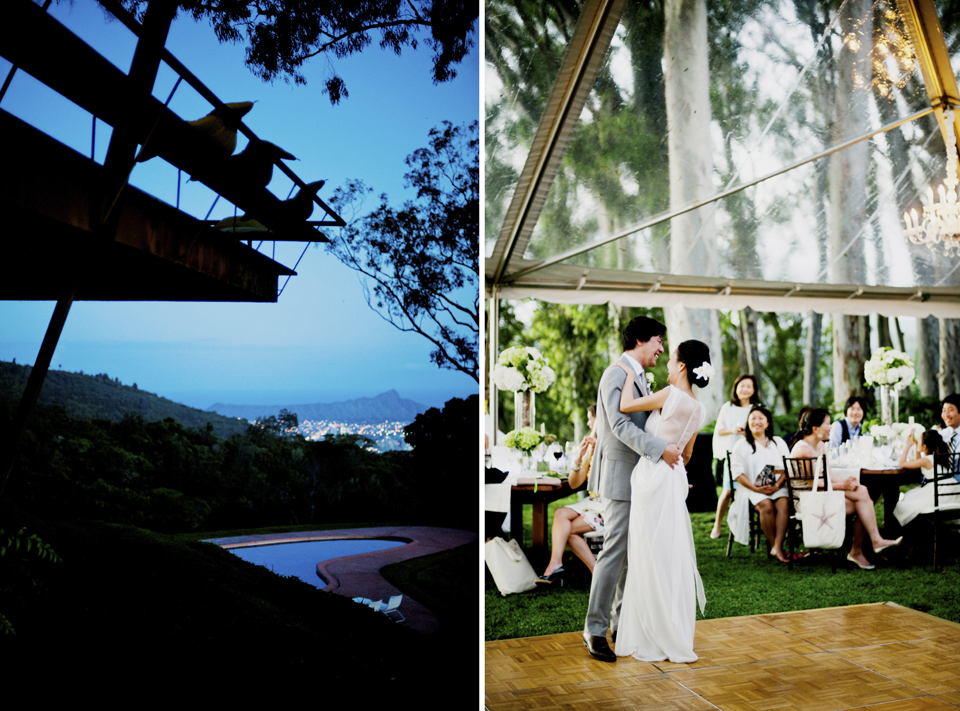 In the chaos and stress of the moments before a wedding, Miyuki turns to me and asks if I need anything to drink, and did I get a chance to go the beach this morning. She and Osamu are some of the most graceful and lovely people I have met in a long time, the kind of people you just want to take it and absorb. At their wedding I realized their family and friends are all reflections of their bright spirits. It was a personal, and special wedding with the couple's good friend officiating the outdoor ceremony up in the hills of Honolulu at the gorgeous Liljestrand House. Osamu is the perfect match for Miyuki, as her parents said at the reception, "because she chose him. " Miyuki looked perfect in a J. Mendel dress and Monolo Blahnik shoes. The event was flawlessly organized by Current Affairs with live music by Ian O'Sullivan.